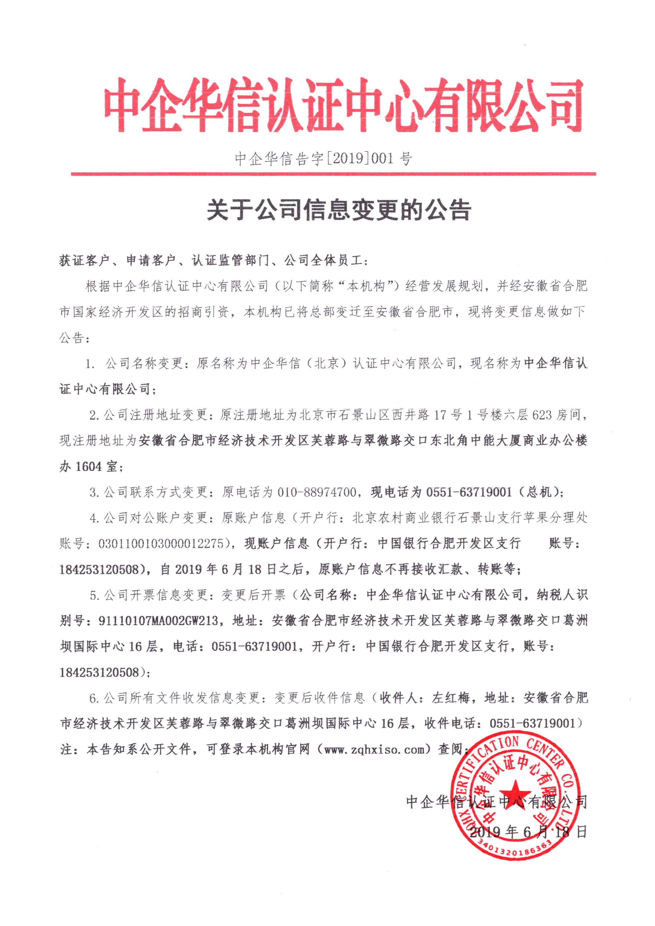 根據(jù)中企華信認(rèn)證中心有限公司(以下簡稱“本機(jī)構(gòu)”)經(jīng)營發(fā)展規(guī)劃,并經(jīng)安徽省合肥市國家經(jīng)濟(jì)開發(fā)區(qū)的招商引資,本機(jī)構(gòu)已將總部變遷至安徽省合肥市,現(xiàn)將變更信息做如下公告:詳情請見以下附件。