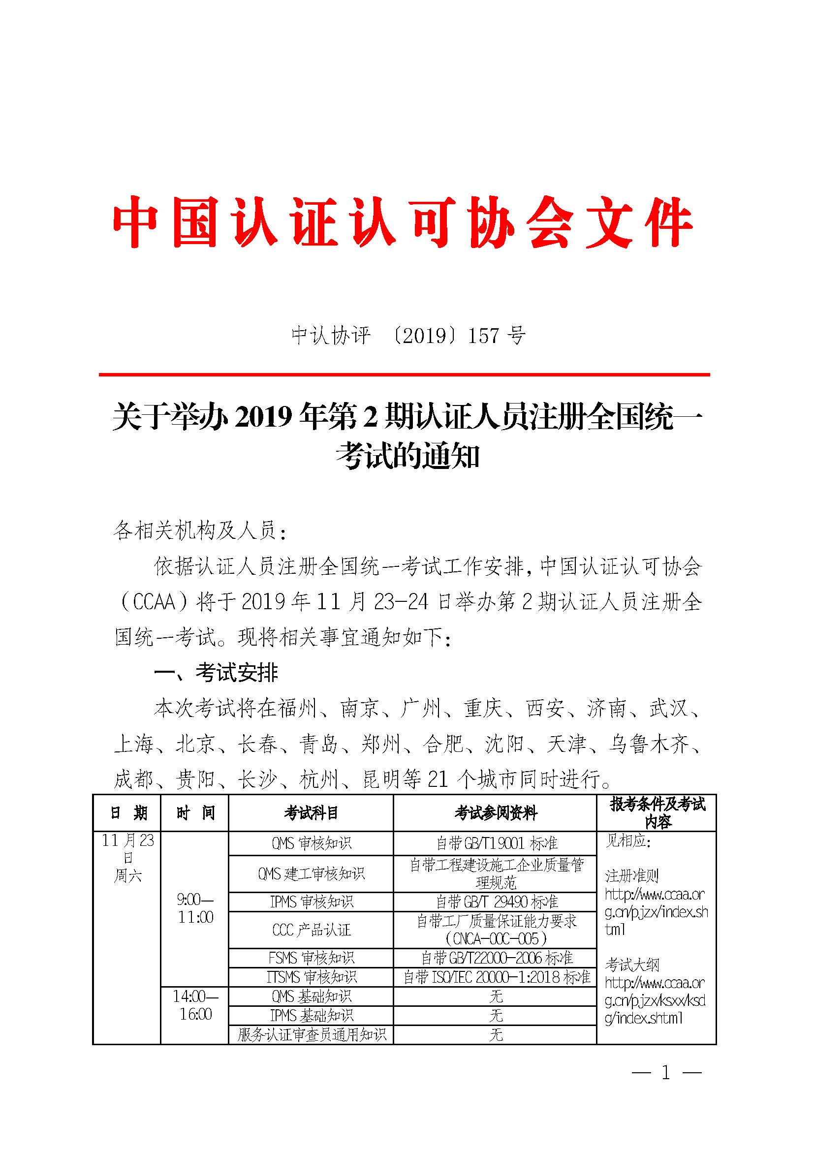 依據認證人員注冊全國統一考試工作安排,中國認證認可協會(CCAA)將于2019 年11 月23-24 日舉辦第2 期認證人員注冊全國統一考試,具體事宜見附件。